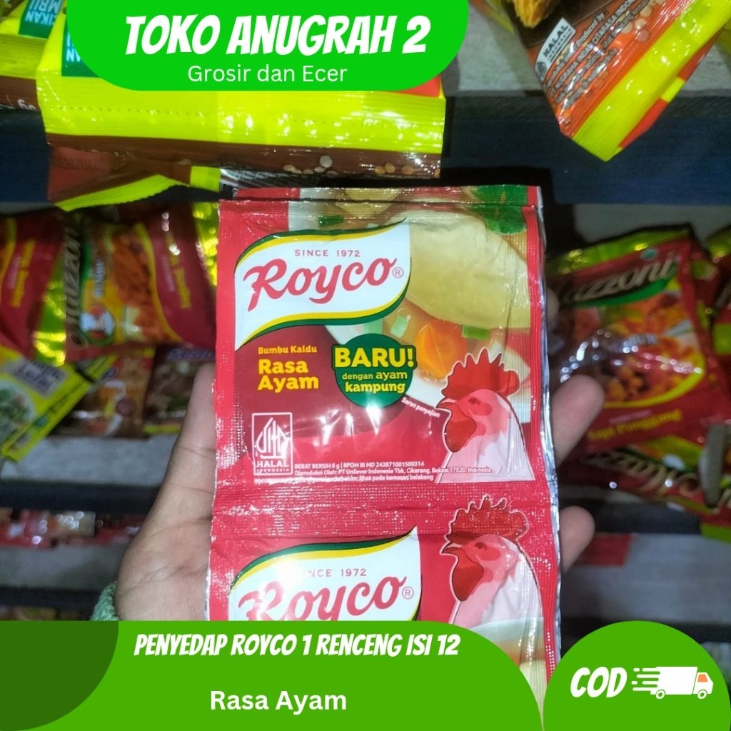 Penyedap Rasa Royco Ayam dan Sapi isi 1 renceng 12 pcs @9 gram. Dapat digunakan sebagai tambahan penyedap masakan agar lebih lezat.