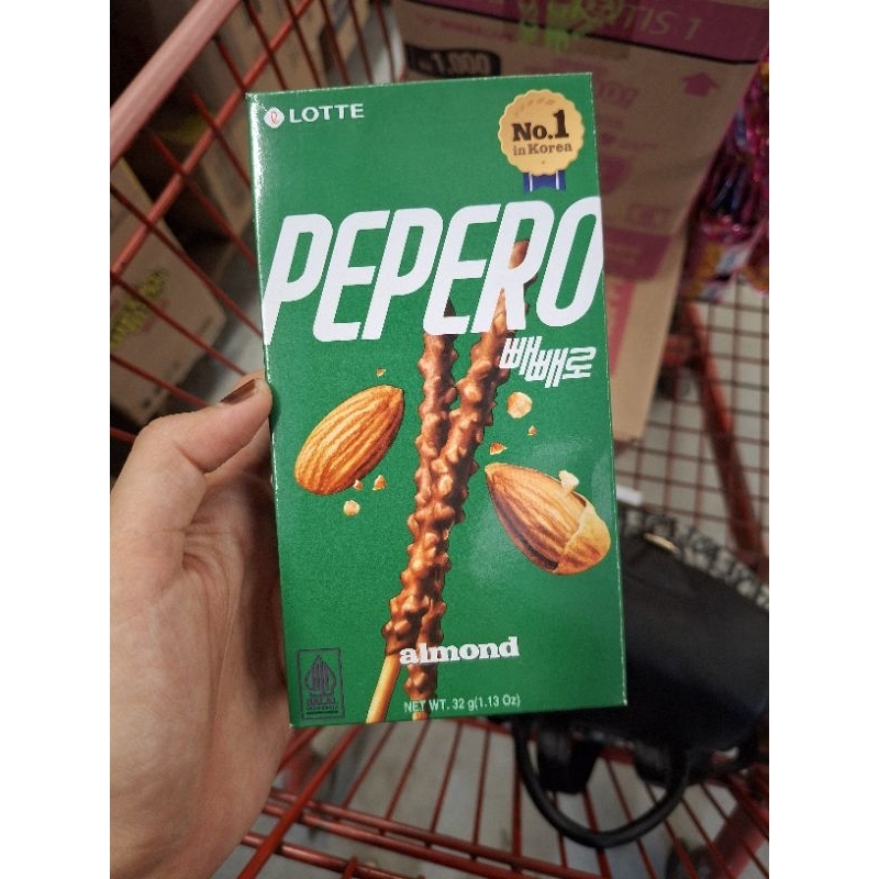 Korea Makanan merek nomor 1 di korea. Snack biscuit stick yang dilapisi dengan coklat dan dikombinasikan dengan cookies yang membuatnya menjadi semakin nikmat. Lotte Pepero Almond, makanan merek nomor 1 di korea. Lotte,pepero almond/biskuit salut coklat dan kacang almond. Snack biscuit stick yang dilapisi dengan coklat dan dikombinasikan dengan almond asli yang membuatnya menjadi semakin nikmat. Makanan kering Cocok dinikmati sebagai cemilan saat santai Anda bersama keluarga atau saat dalam perjalanan Rasa cokelat almond. Lotte Pepero White Cookie, biskuit stick dengan lapisan white chocolate dan taburan cookies dark yang enak dan lezat dengan komposisi tepung terigu, cokelat chip, minyak nabati (mengandung antioksidan BHA), laktosa, susu bubuk full cream 8.77%, gula, lemak kakao, susu bubuk 0.913%, kakao bubuk, mentega, minyak kelapa sawit, telur, minyak olein kelapa sawit, sirup glukosa fruktosa, pengemulsi lesitin kedelai, garam, ekstrak malt, pengembang, perisa sintetik vanila, penstabil tritanium fosfat, sirup jagung tnggi fruktosa, whey bubuk, beras ketan, perlakuan tepung papain, ragi instan, anti oksidan d-alfa tokoferol.