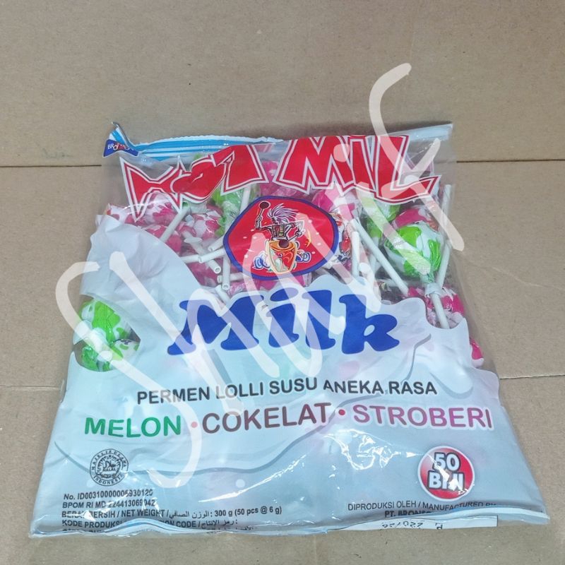 Permen Hot Mil Milk, permen lolli susu aneka rasa. Kemasan refil 1 bag isi 50 @ 6 gram. Netto per bag 300 gram