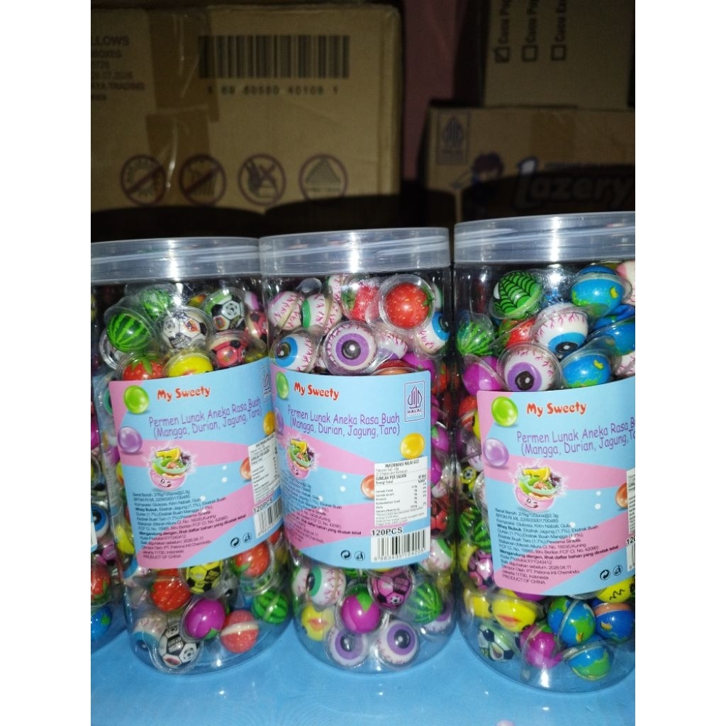 Permen lunak aneka rasa buah ( mangga, durian, jagung, taro) 1 toples isi 120 bj x 2.3 gr
