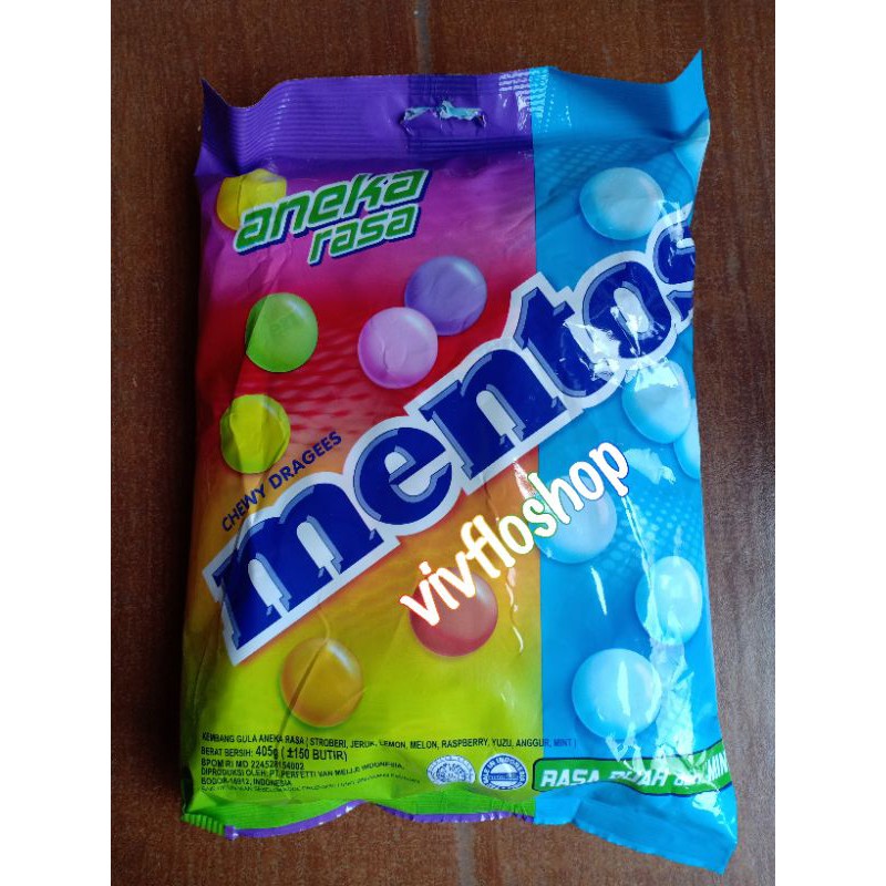 Permen Mentos Mix (Mints & Fruits) kemasan bag isi sekitar 150 pcs, netto 405 gram.