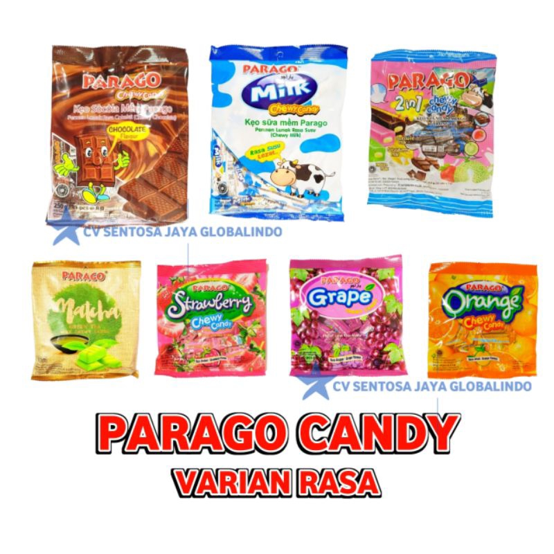 Permen Parago Permen Lunak bermacam varian rasa, ada rasa cokelat, jeruk, strawberry, matcha, susu, anggur dll...