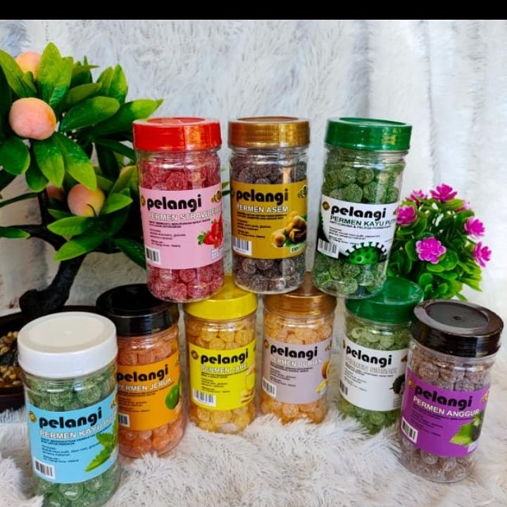 Permen dengan 9 variant rasa yaitu Minyak Kayu Putih, Minyak Kayu Putih+Mint, Jahe, Asem, Strawbery, Anggur, Jeruk, Sirsak dan Durian dalam kemasan botol 150gr bersegel, ada barcode dan ada PIRT