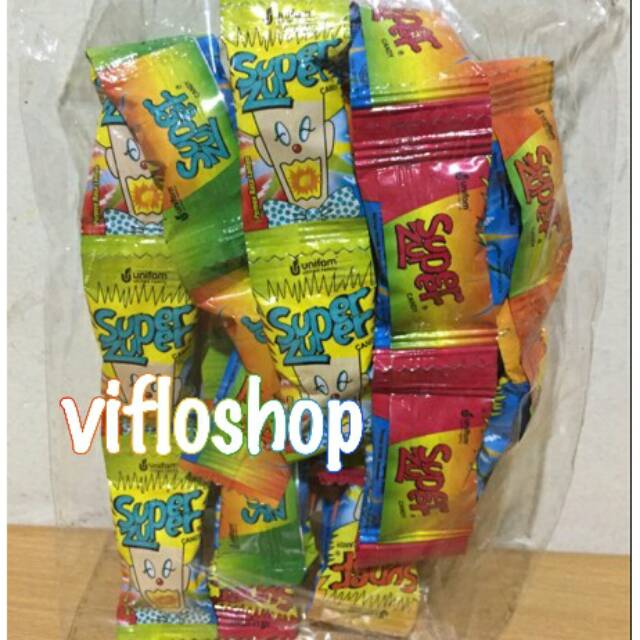 Permen Super Zuper isi 30 pcs, sudah mix rasa dalam 1 bungkus. Netto 1 bungkus sekitar 90 gram.