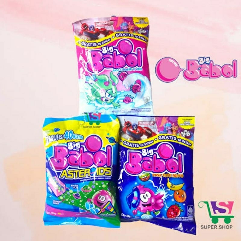 Permen Karet Big Babol, tersedia dalam 4 pilihan rasa : , - Tutti Frutti, - Krim Stroberi, - Asteorids, - Sour