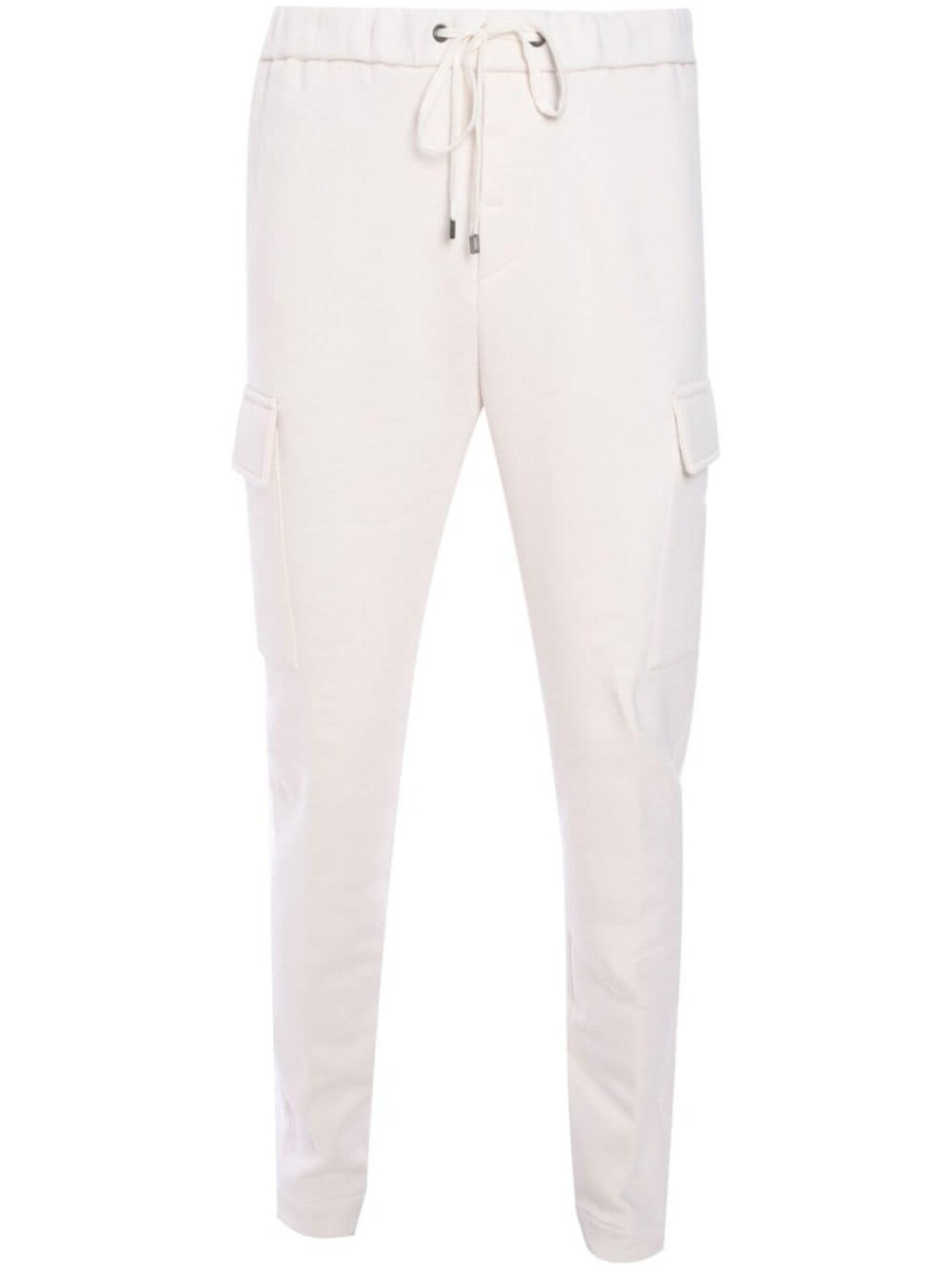 Подробнее о товаре: • белый • хлопок • серебристый металлический логотип • эластичный пояс на шнурке • два прорезных кармана по бокам • два кармана с клапанами по бокам • зауженный крой