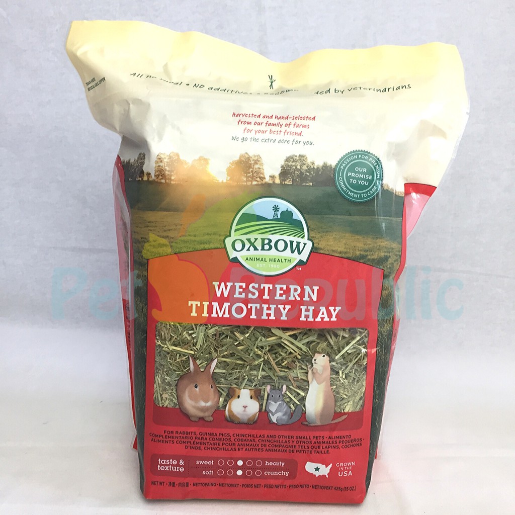 WESTERN TIMOTHY HAYLooking for a good, basic grass hay with high quality nutrition, and a fresh fragrance that’s irresistible to small herbivores?Oxbow Western Timothy Hay is the ideal long-strand fiber source for keeping small animal digestive tracts functioning properly.Our most popular grass hay—with high fiber, low protein and low calcium content—is widely recommended by veterinariansIngredients100% Timothy Hay. Preservative and additive free. Loose hay contains stems, leaves, and limited seed heads.Guaranteed AnalysisCrude Protein min 7.00%Crude Fat min 1.50%Crude Fiber max 32.00%Moisture max 15.00%
