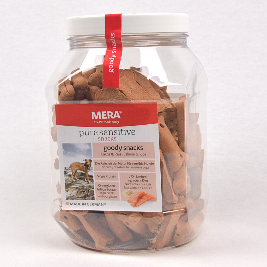 A proper reward for sensitive dogs_x000D__x000D_Extremely tasty, gluten-free dog biscuits. For demanding dogs that are susceptible to allergies. These dog biscuits are an integral constituent of the pure food concept as an ideal reward for your dog. They are delicious and easily digestible, and round off the daily daily pure nutrition perfectly._x000D__x000D_ Gluten-free_x000D_ 18,5 % protein / 6,5 % fat_x000D_ Only 1 source of meat and carbohydrate_x000D_ 100% Made in Germany_x000D_ Produced to foodstuff standards_x000D_ Produced with green electricity - CO2 neutral_x000D_ No colourants or preservatives_x000D__x000D_Composition Meradog dog biscuits pure salmon & rice:_x000D__x000D_Grains (exclusively 72 % rice), fish and fish derivatives (exclusively 18 % salmon, dried), derivatives of vegetable origin (chicory powder, = 0.10 % inulin), oils and fats, minerals, yeasts_x000D_Analysis Meradog dog biscuits pure salmon & rice:_x000D__x000D_Protein 18.50 %, fat content 6.50 %, crude fiber 2.50 %, crude ash 6.00 %, calcium 0.90 %, phosphorus 0.70 %, sodium 0.60 %._x000D_Nutritional additives per kg Meradog dog biscuits pure salmon & rice:_x000D__x000D_Vitamin A 5,000 IU, vitamin D3 500 IU, vitamin E 50 mg_x000D_Technological additives per kg Meradog dog biscuits salmon & rice:_x000D__x000D_Antioxidants_x000D__x000D_ _x000D_Feeding instructions_x000D__x000D_Small breeds 2 to 4 pieces per day_x000D__x000D_Mid-sized breeds 5 to 7 Stck per day_x000D__x000D_Large breedas 8 to 9 Stck per day_x000D_We recommend: