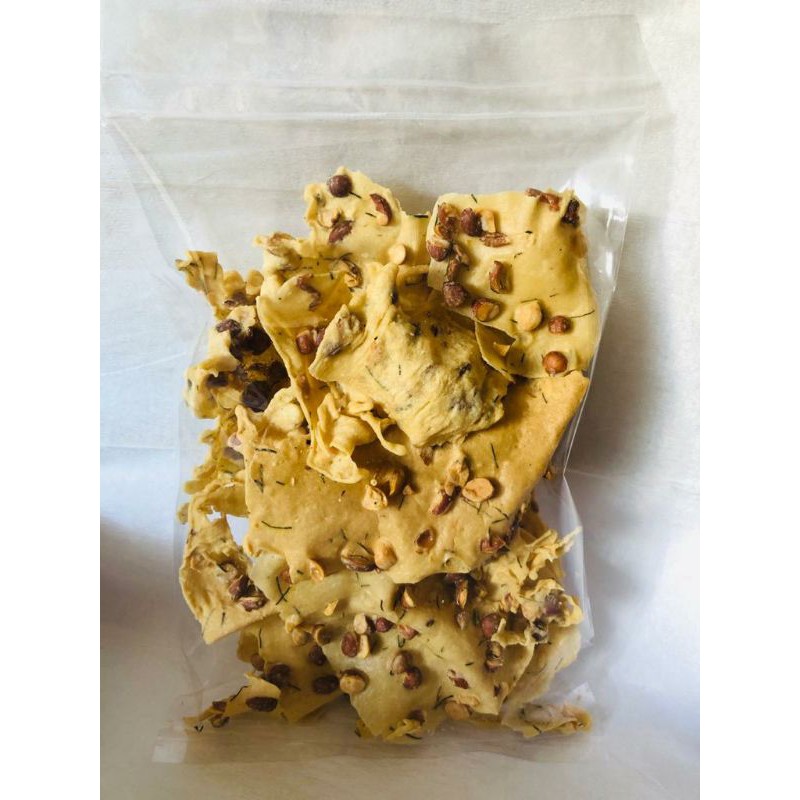 Peyek dengan topping kacang berkualitas. Rasa gurih dengan tekstur yang tipis renyah, sangat cocok dijadikan cemilan atau menu pelengkap makan kamu.