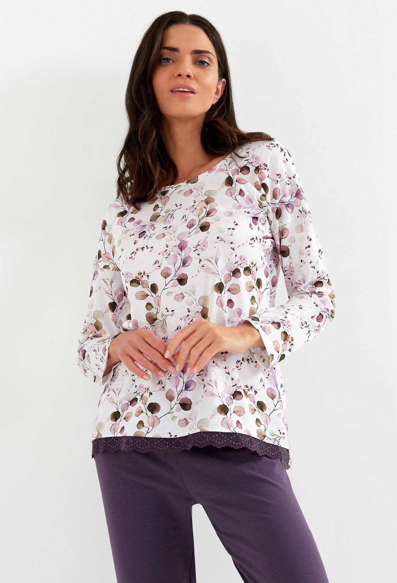 Bluzka z długim rękawemDekolt półokrągłyDół wykończony koronkąLuźny, komfortowy krójMiękka i przewiewna tkaninaPozwala skórze oddychaćProdukt polskiPrzewiewna dzianina/tkaninaSpodnie bez kieszeniSpodnie długieWysoka jakośćDół - Bawełna: 95%Dół - Elastan: 5%Góra - Bawełna: 100%