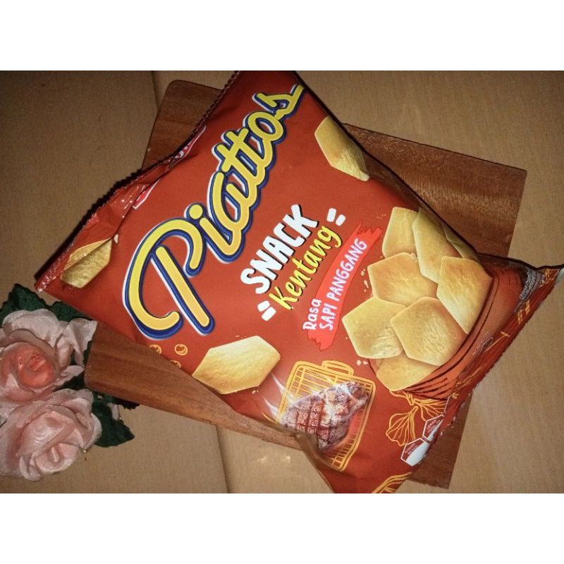 Piattos rasa sapi panggang adalah snack kentang berbentuk hexagonal yang gurih, garing, dan dibuat dengan kentang pilihan.