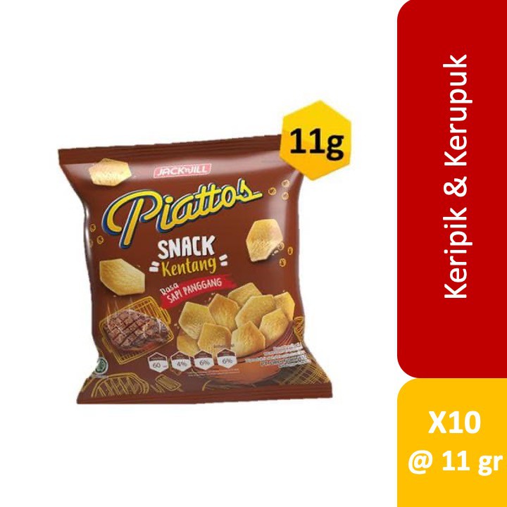 Piattos Sapi Panggang 11gr adalah salah satu camilan renyah dan gurih yang dapat menjadi pilihanmu. Merupakan keripik kentang berbentuk segi enam yang unik dengan tekstur yang tebal. Piattos dihasilkan dari kentang pilihan dan bumbu lezat yang akan menjadi kesukaanmu. Shelf life: 12 bulan.