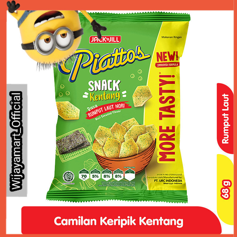 Piattos Snack Kentang Rumput Laut 68 g adalah sebuah keripik kentang berbentuk unik. Terbuat dari kentang asli berkualitas, yang diolah secara higienis dan modern menggunakan teknologi tinggi. Kentang yang telah dicuci bersih dan dikupas di potong berbentuk segi 6 yang unik. Diiris tipis dan digoreng pada suhu yang tepat, sehingga menghasilkan kerikpik kentang berbentuk segi 6 dengan tekstur yang renyah. Dibalur dengan taburan perisa rumput laut yang nikmat, memberikan rasa asin gurih dan yang lezat pada keripik kentang. Dikemas dalam kemasan kantung ukuran 68 gram untuk menjaga rasa dan kualitas keripik. Cocok dijadikan cemilan saat sedang bersantai atau berkumpul bersama teman. Rasakan nikmatnya keripik kentang berbentuk unik pada Piattos Snack Kentang Rumput Laut 68 g.