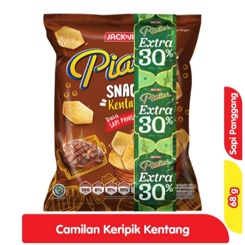 Piattos Snack Kentang Sapi Panggang 68 g adalah sebuah keripik kentang berbentuk unik. Terbuat dari kentang asli berkualitas, yang diolah secara higienis dan modern menggunakan teknologi tinggi. Kentang yang telah dicuci bersih dan dikupas di potong berbentuk segi 6 yang unik. Diiris tipis dan digoreng pada suhu yang tepat, sehingga menghasilkan keripik kentang berbentuk segi 6 dengan tekstur yang renyah. Dibalur dengan taburan perisa sapi panggang bubuk yang nikmat, memberikan rasa asin gurih yang nikmat pada keripik kentang. Dikemas dalam kemasan kantung ukuran 68 gram untuk menjaga rasa dan kualitas keripik. Cocok dijadikan cemilan saat sedang bersantai atau berkumpul bersama teman. Rasakan nikmatnya keripik kentang berbentuk unik pada Piattos Snack Kentang Sapi Panggang 68 g.