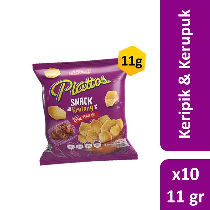 Piattos Teriyaki 11gr adalah salah satu camilan renyah dan gurih yang dapat menjadi pilihanmu. Merupakan keripik kentang berbentuk segi enam yang unik dengan tekstur yang tebal. Piattos dihasilkan dari kentang pilihan dan bumbu lezat yang akan menjadi kesukaanmu. Shelf life: 12 bulan. BPOM: MD 272910012019. BPOM MD 272910012019,Shelf Life: 12 Bulan
