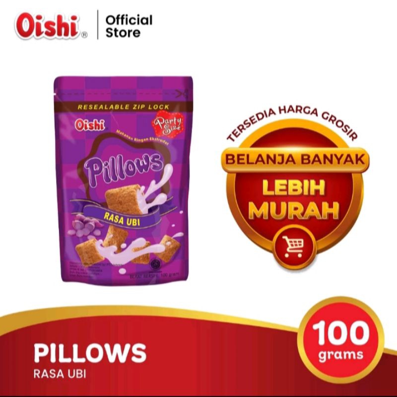 Oishi Pillows Ubi adalah satu-satunya camilan modern yang rasanya membuat para penikmatnya penasaran. Cemilan ini sudah menggoda hanya dengan melihat kemasannya. Spon renyah-lembut yang dibuat dari jagung dan beras dilumuri dengan lelehan cokelat yang membuat cokelat meresap dan terkunci dalam pori-pori spon-nya.