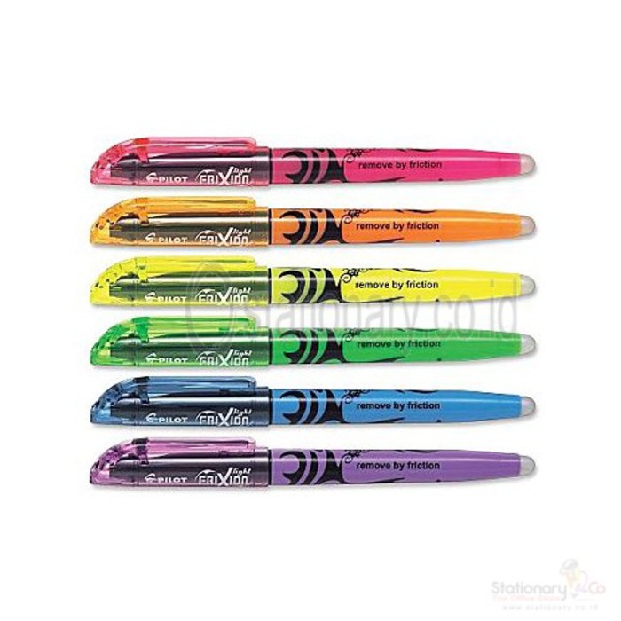 Pilot Frixion Highlighter SW-FRL adalah highlighter atau penebal tulisan pada dokumen atau tulisan anda, biasanya untuk menandakan hal penting atau catatan yang anda inginkan perlu diperhatikan. Keunggulan Pilot Frixion Highlighter SW-FRL ini adalah anda dapat MENGHAPUS secara sempurna highlighter yang telah anda tebalkan pada tulisan atau dokumen anda, hanya dengan menggunakan ujung atas dari Pilot Frixion Highlighter SW-FRL. Tersedia berbagai macam warna. Harga adalah satuan per pcs.