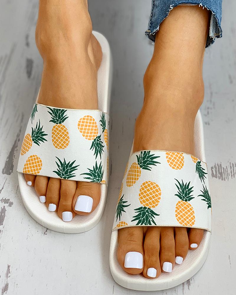 Pineapple Pattern Open Toe Flat Slider Sandals, White