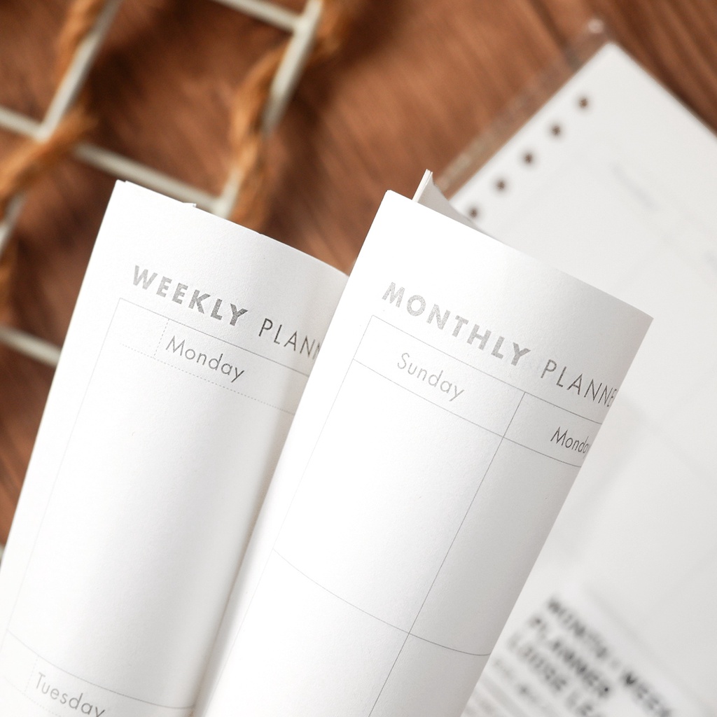 Seri terbaru kertas loose leaf Monthly + Weekly dari panmomo menghadirkan perencana komplit untuk binder-mu dalam satu kemasan yang praktis. Gunakan untuk mengatur jadwal, mencatat kegiatan sehari-hari, dan atau membuat goal dan projek yang perlu dicapai. Satu set loose leaf berisi 15 lembar monthly planner dan 55 lembar weekly planner, cukup untuk mencatat hingga 14 bulan / 54 minggu.