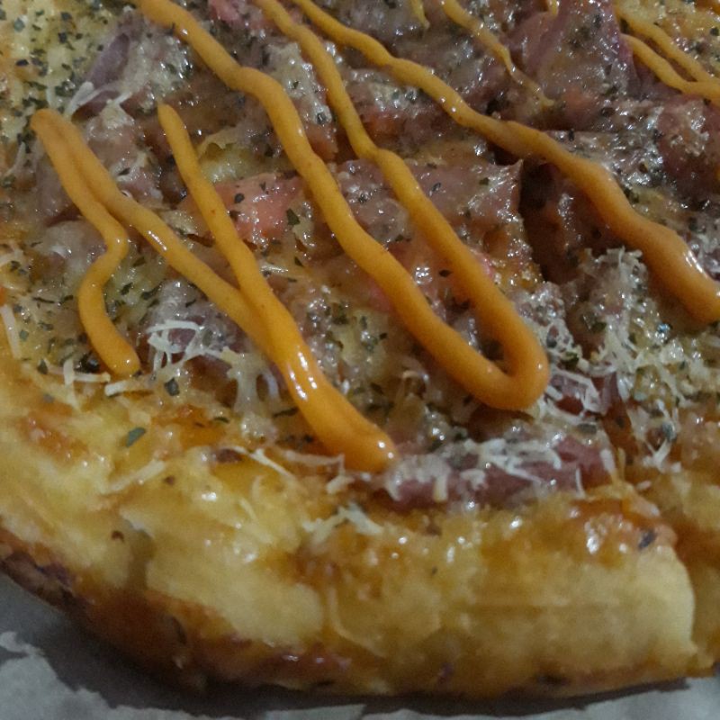 pitsa home made dibuat dengan cintah rasah delisius roti kenyal tipis bener" rasah pitsah gak kaya roti pitsah toping keju mojarela keju cedar daging asap sosis kornet saos barbekyu dgn potongam daging