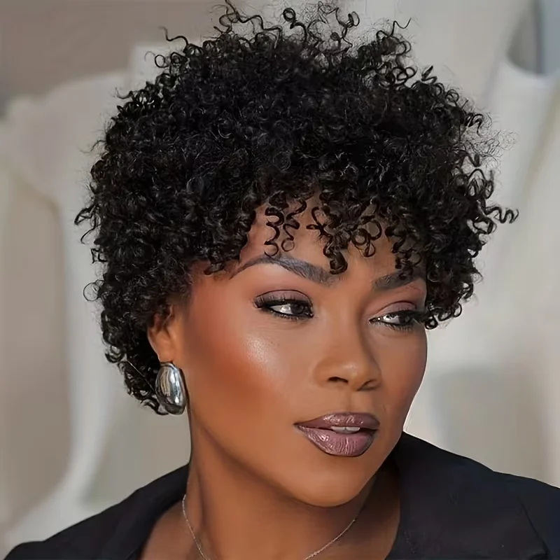 Pixie Short Afro Curly Remy Human Hair Wigs 6 Inch Chic Curly Style With Bangs For Women Machine Made Wig