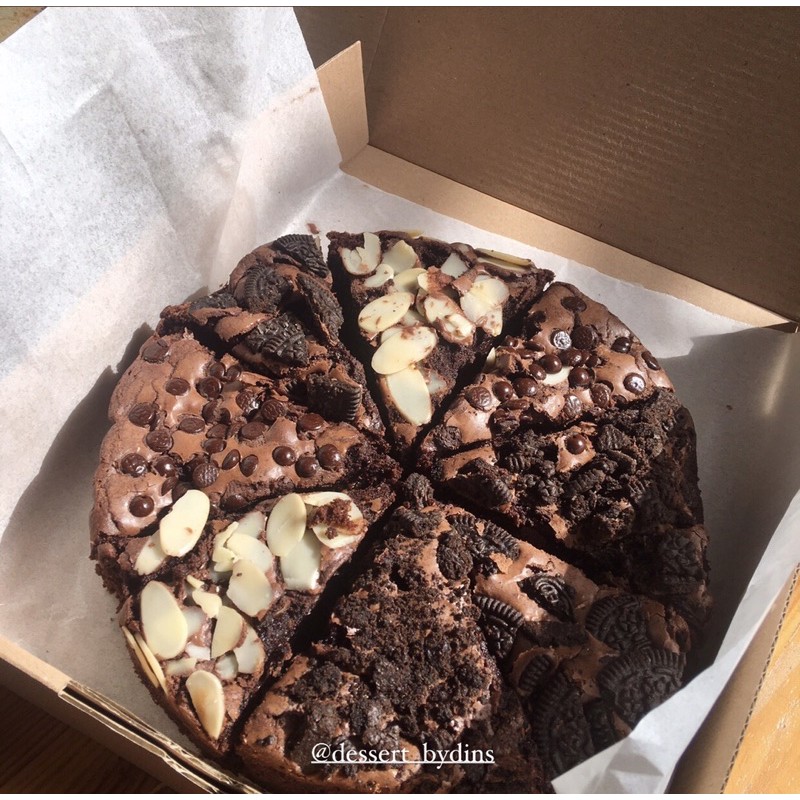 Fudgy Brownies berbentuk pizza dengan pilihan topping: