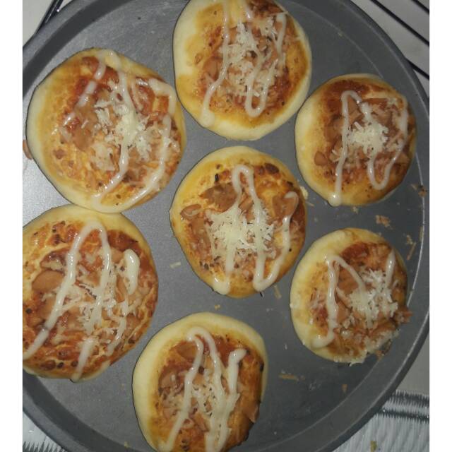 Ready by order pizza mini homemade dg 4 toping yaitu ayam,sosis,jagung,dan sayuran, min order 25 pcs , harga 2rb /pcs