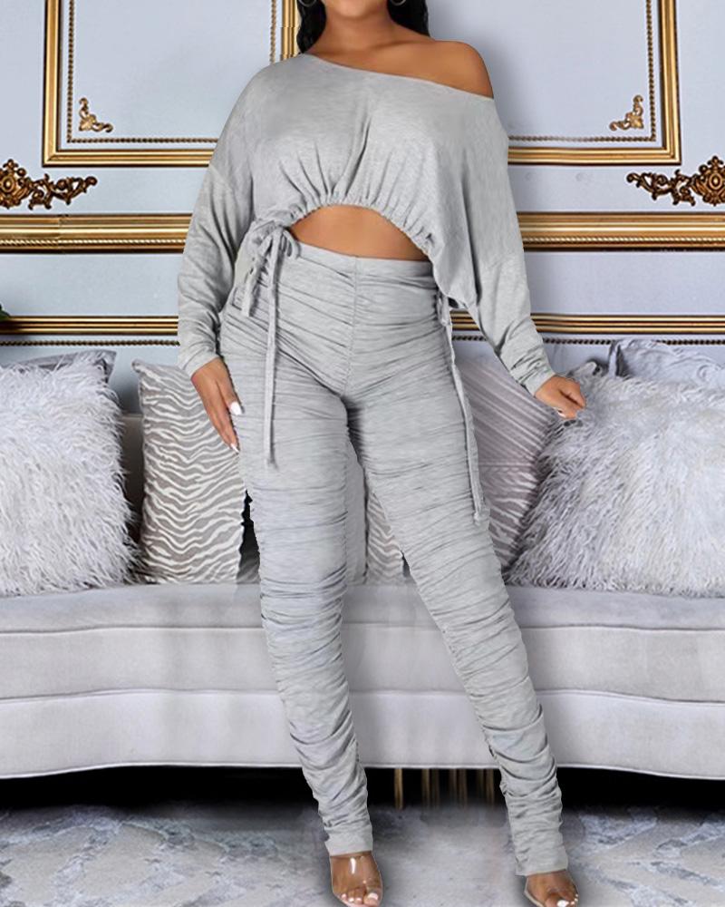 Plain Drawstring Top & Ruched Pants Set, Gray