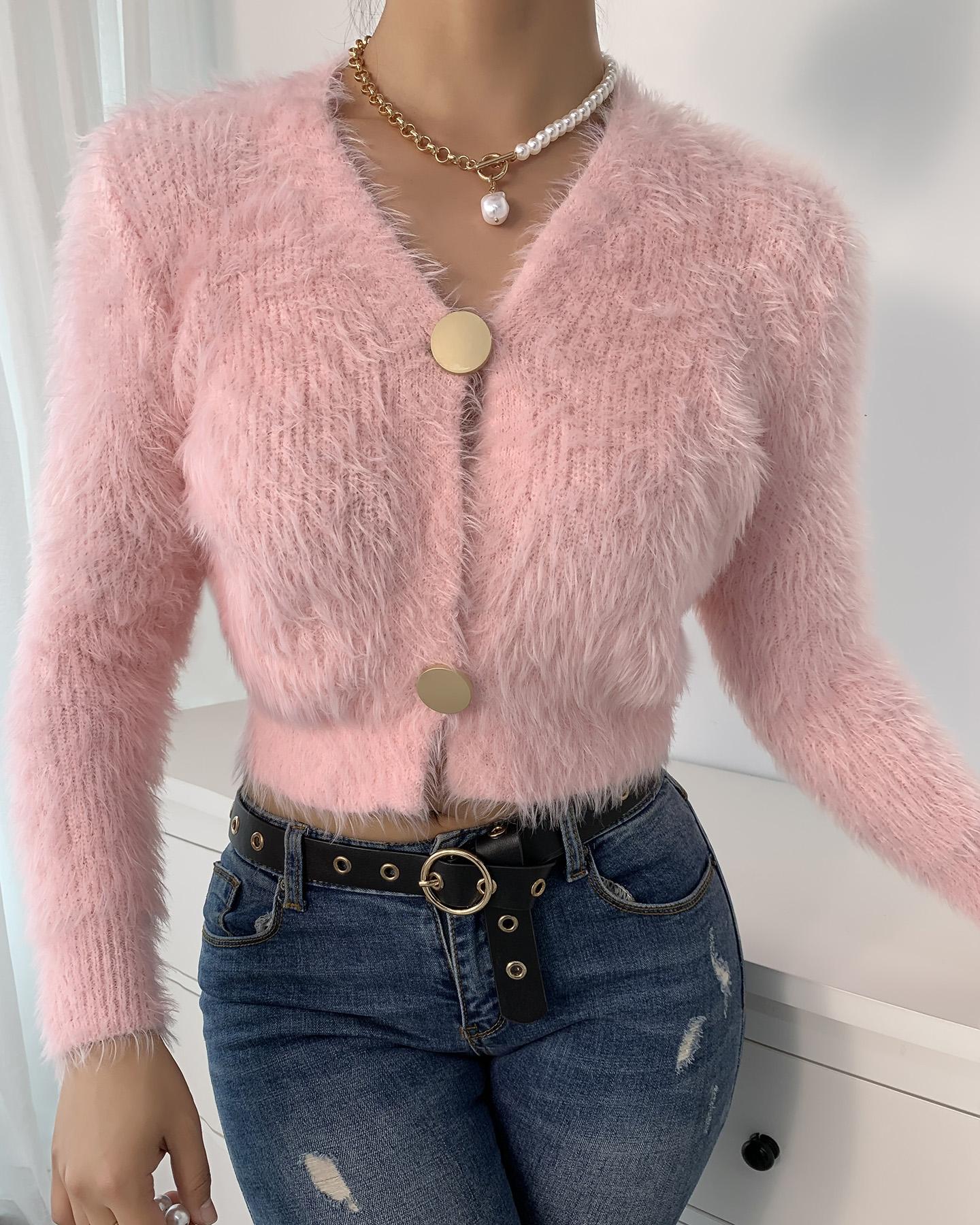 Plain Fluffy Button Design Cardigan, Pink