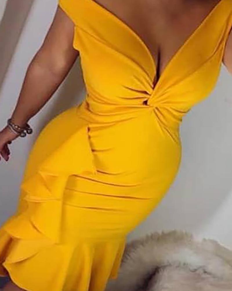 Plain Off Shoulder Ruffle Hem Ruched Dress, Yellow