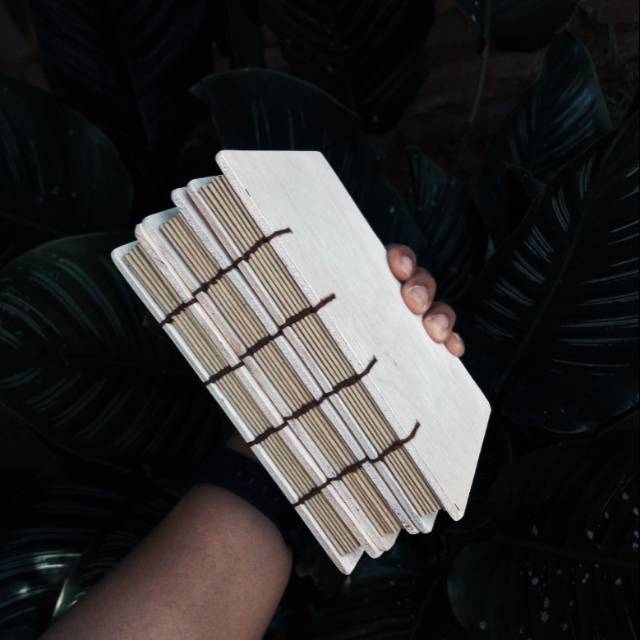 Notebook hardcover dengan cover polos berbahan plywood 4mm, isi 160 halaman kertas samson 80gram, dijilid manual menggunakan teknik coptic stitch binding