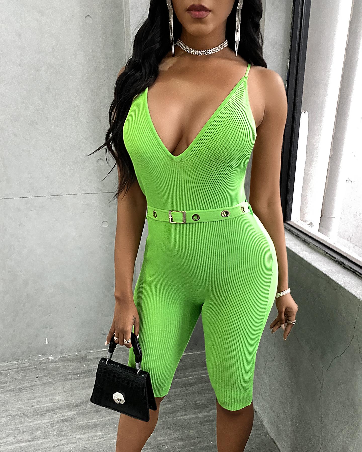 Plain Ribbed Spaghetti Strap Romper, Green