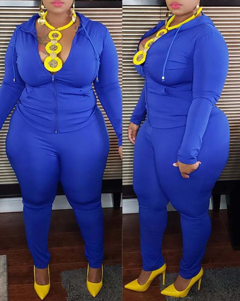 Plain Zipper Design Top & Pants Set, Blue