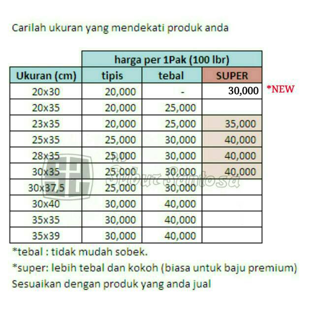 Ukuran plastik per 1pak (100lbr) super/tebal/tipis
