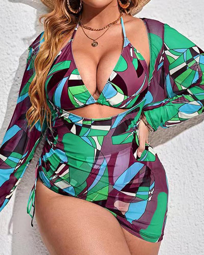 Plus Size 3PCS Abstract Print Bikini Set With Cover Up, Purple