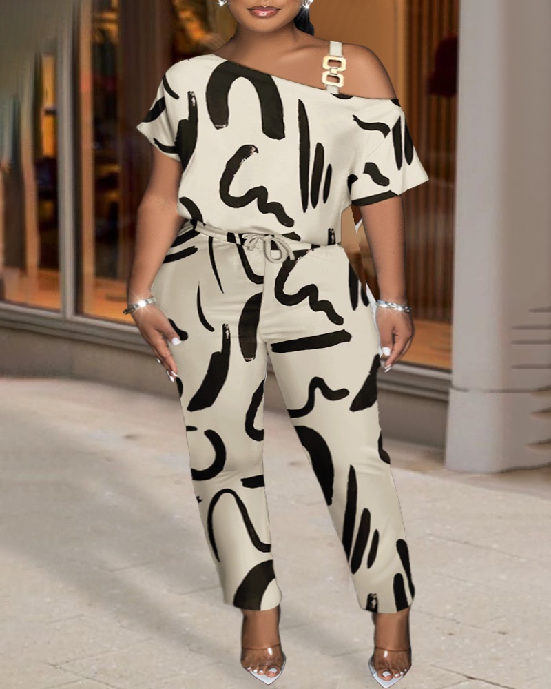 Plus Size Abstract Print Cold Shoulder Chain Decor Jumpsuit, Apricot