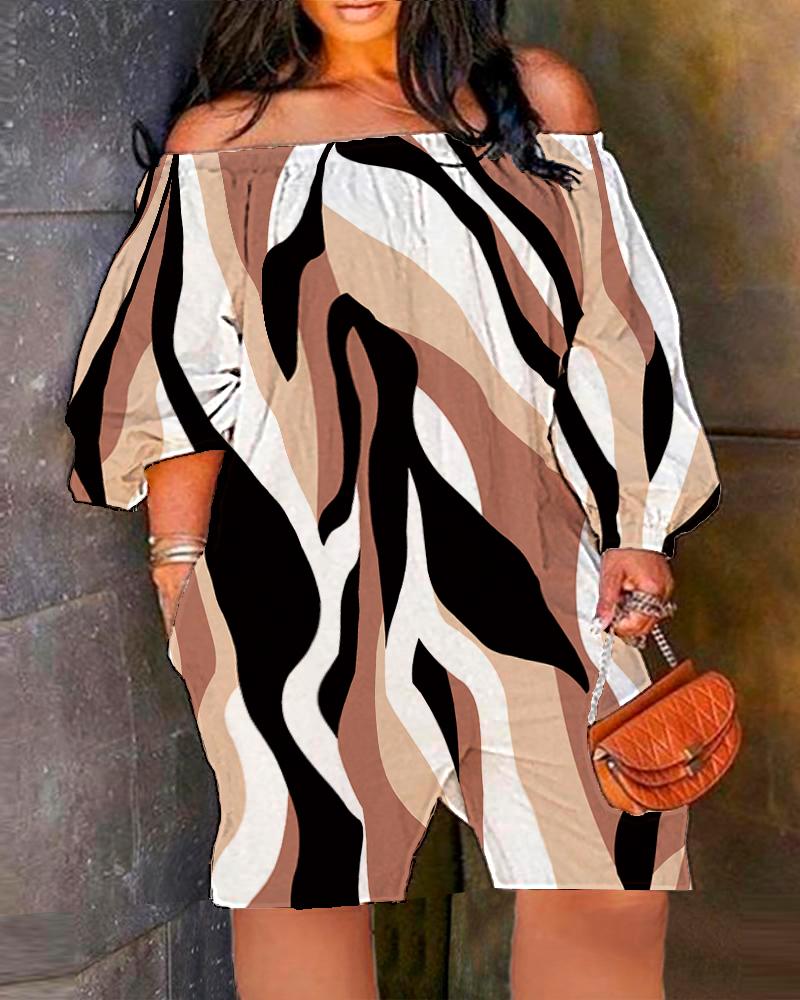 Plus Size Abstract Print Off Shoulder Lantern Sleeve Romper, Brown