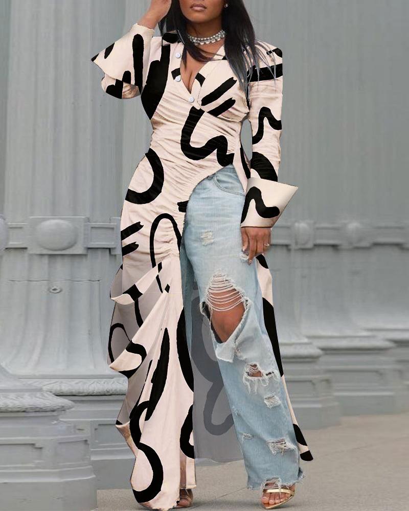 Plus Size Abstract Print Ruched High Slit Longline Top, Apricot