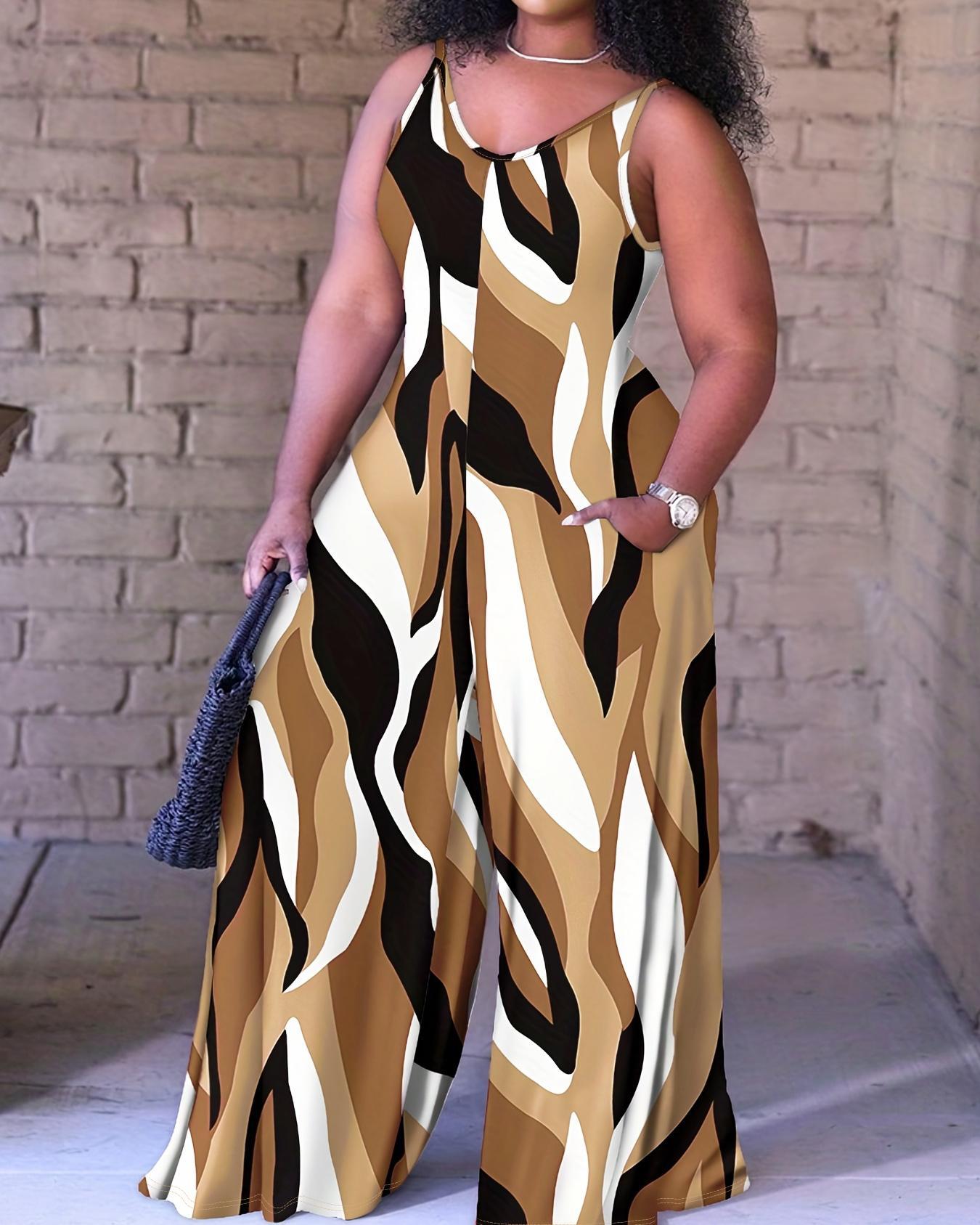 Plus Size Abstract Print Wide Leg Jumpsuit, Khaki