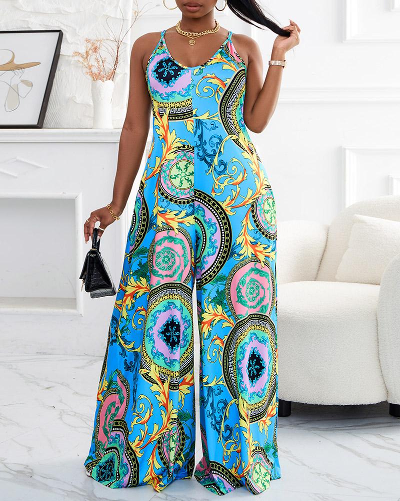 Plus Size Baroque Print Wide Leg Jumpsuit, Blue