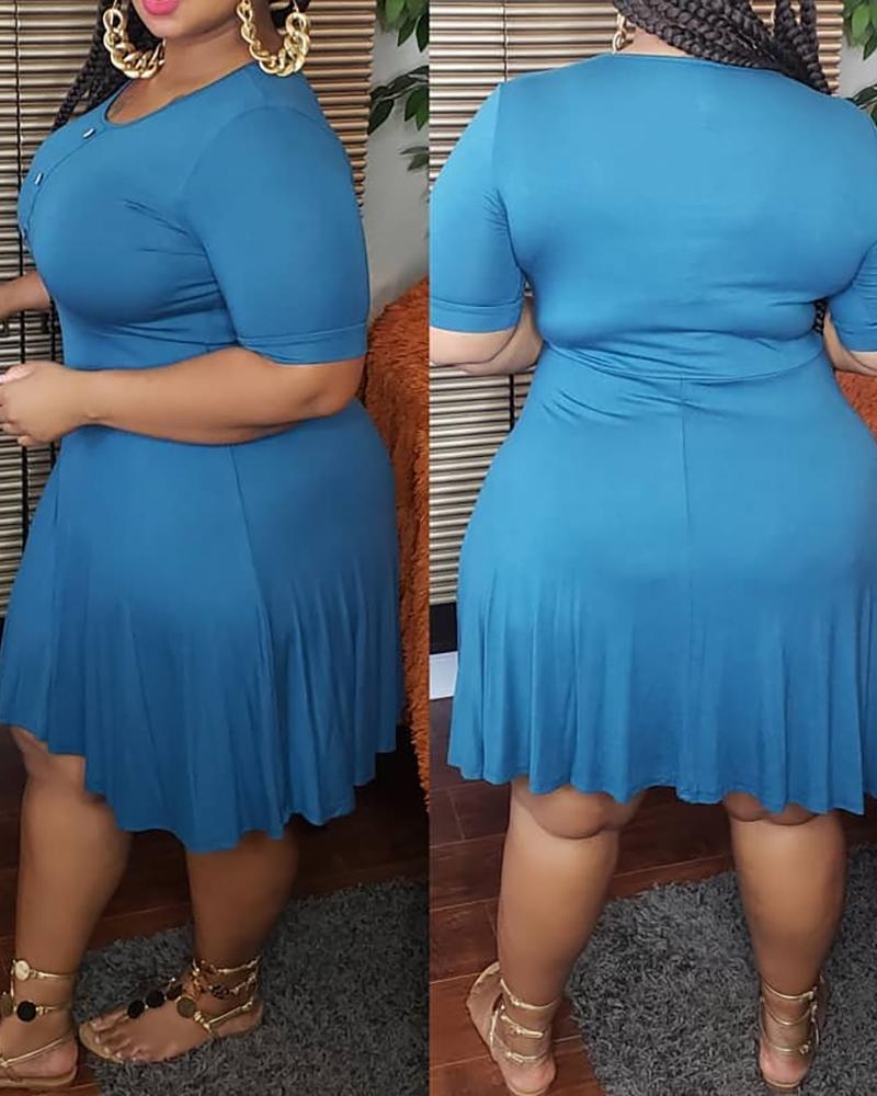 Plus Size Button Design Short Sleeve Ruched Dress, Blue