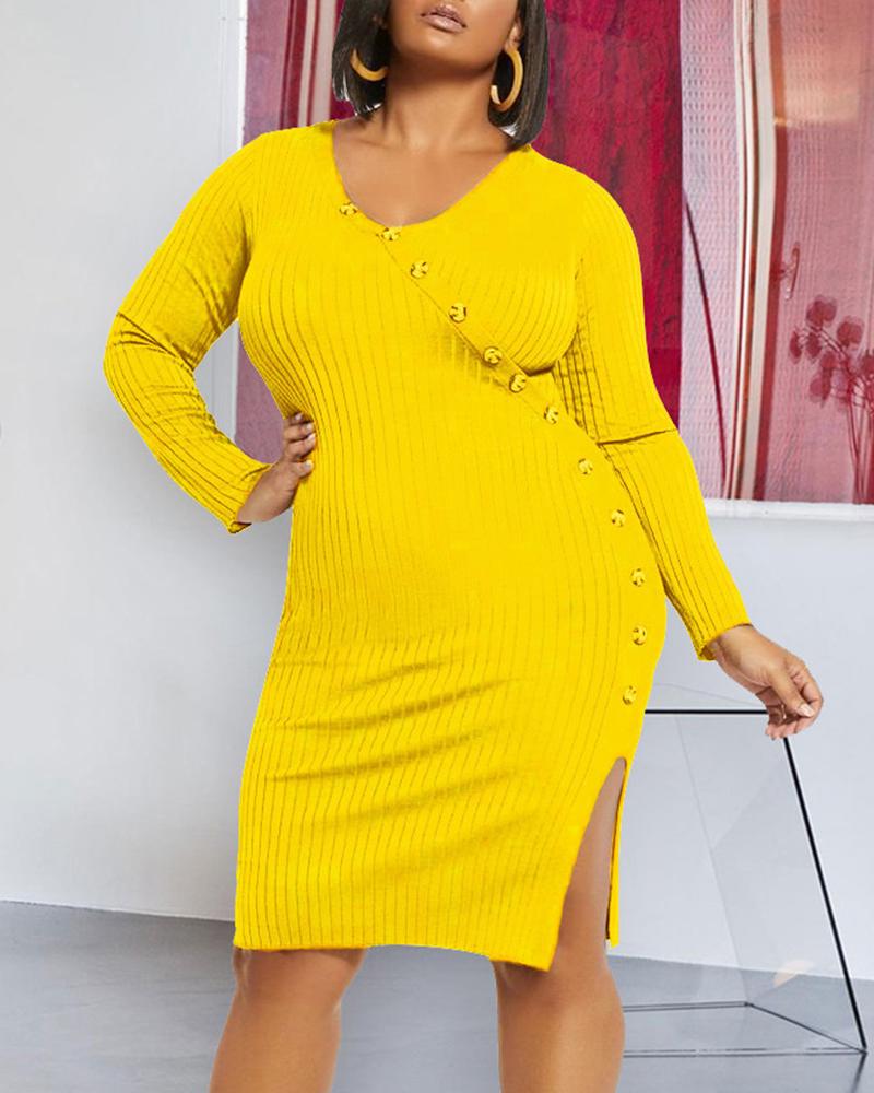 Plus Size Button Detail Long Sleeve Ribbed Bodycon Dress, Yellow