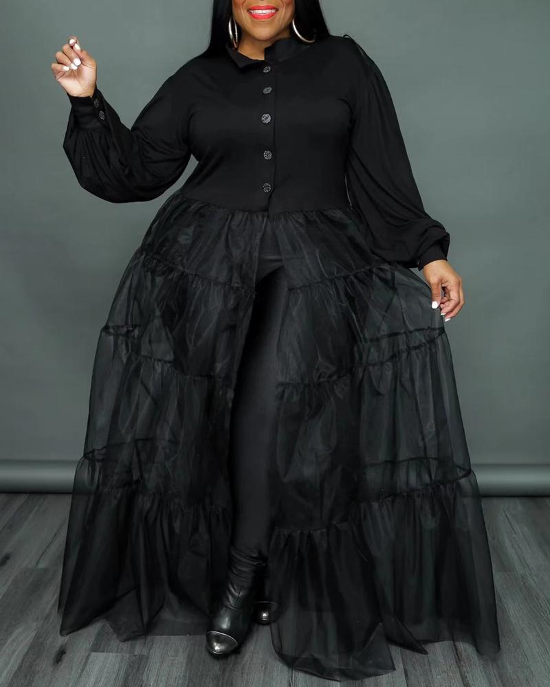 Plus Size Button Front Contrast Mesh Shirt Dress, Black