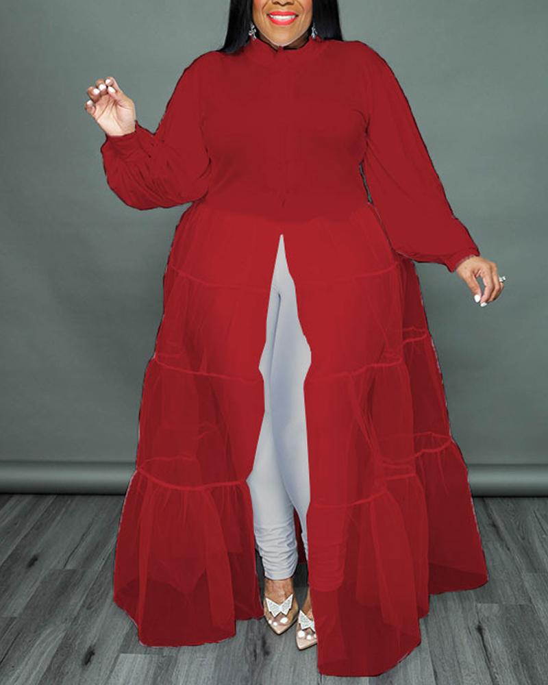 Plus Size Button Front Contrast Mesh Shirt Dress, Wine red