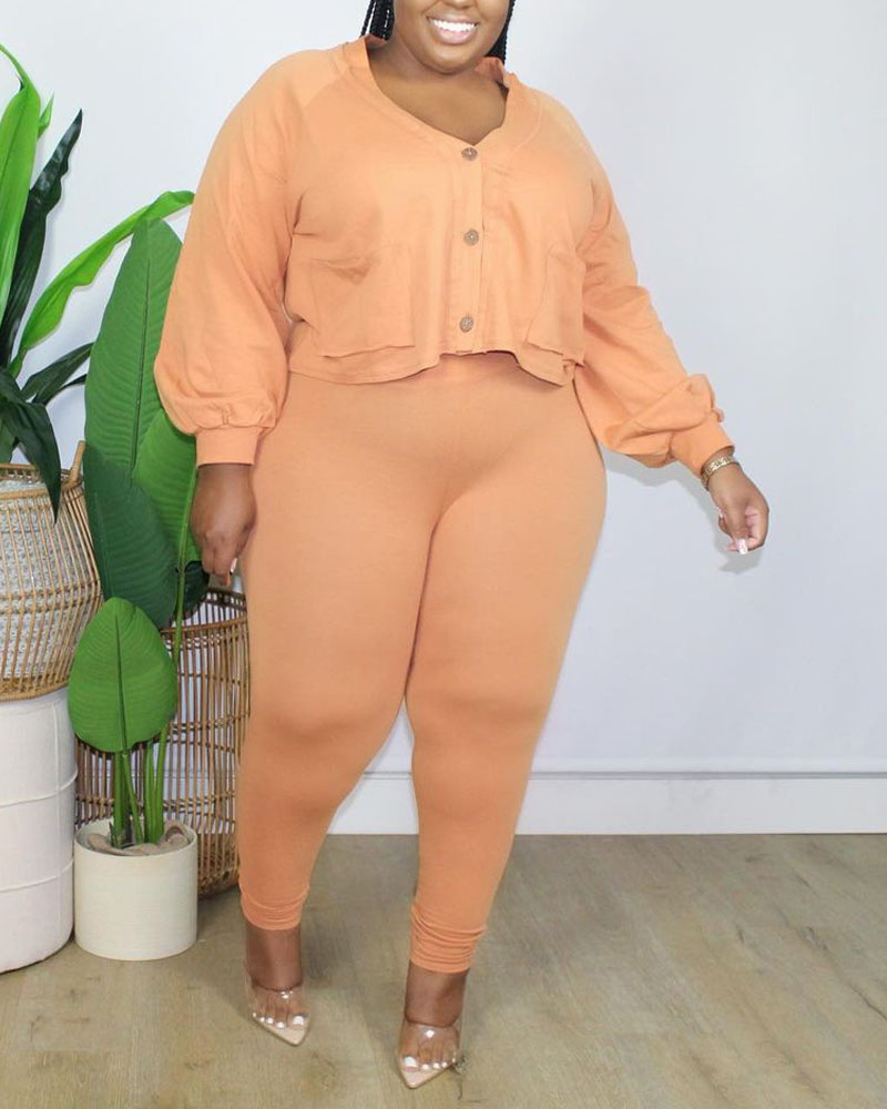 Plus Size Button Front Crop Top & Pants Set, Orange