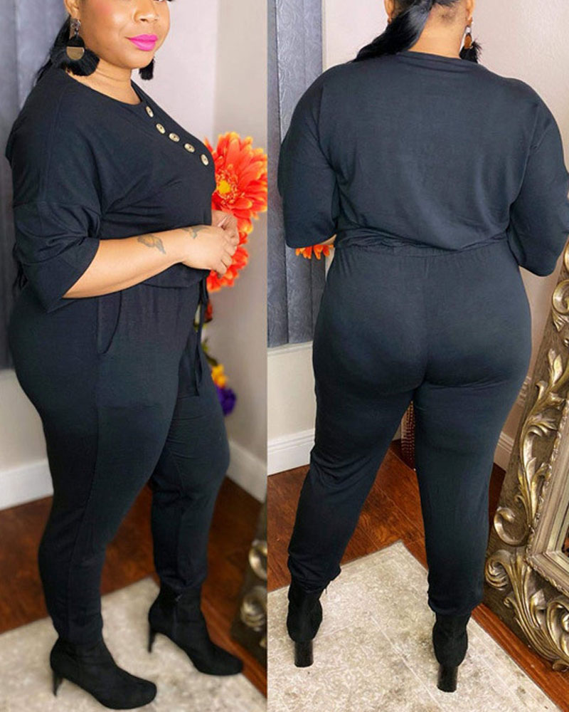 Plus Size Button Front Drawstring Waist Jumpsuit, Black