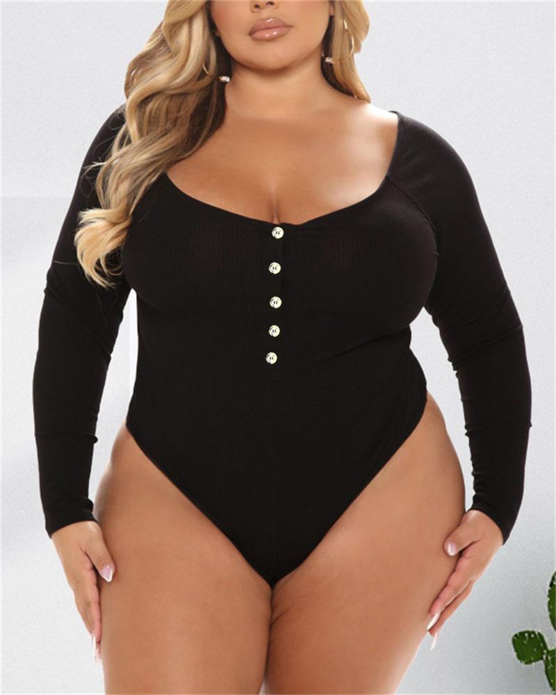 Plus Size Button Front Long Sleeve Bodysuit, Black