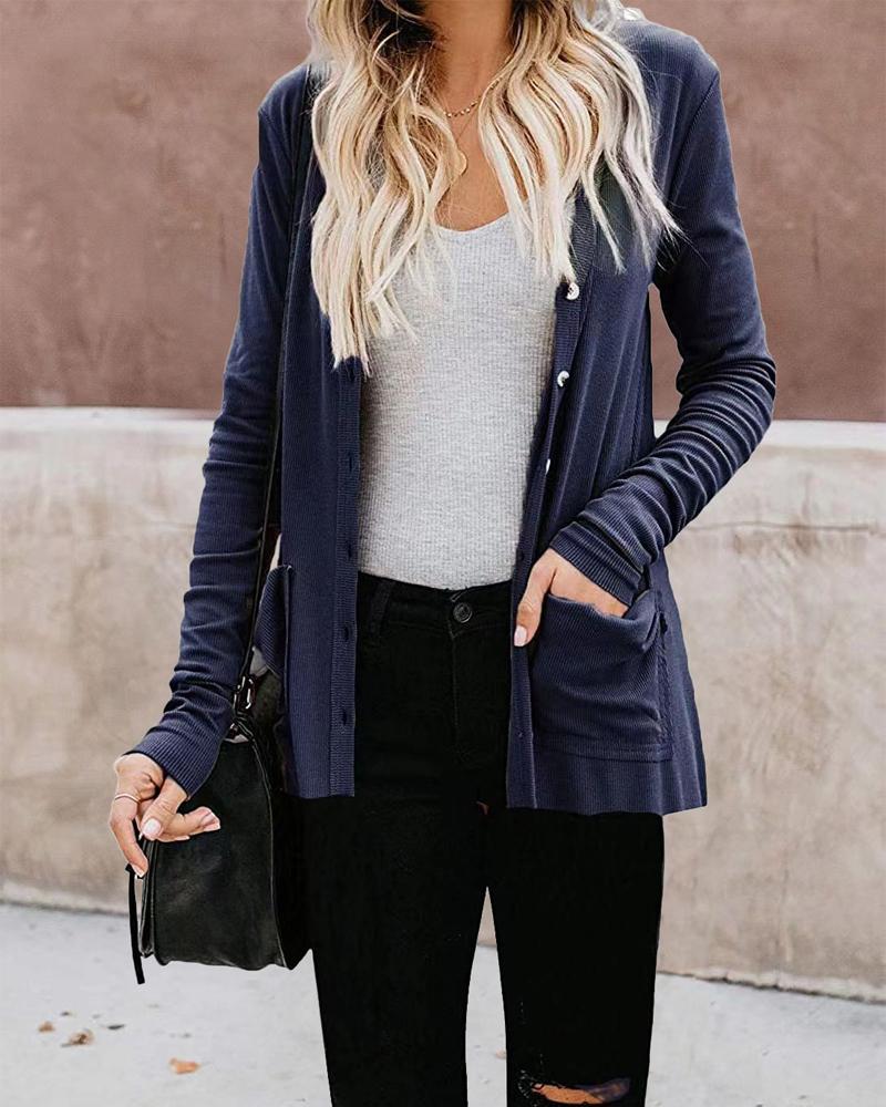 Plus Size Button Front Long Sleeve Ribbed Cardigan, Purplish blue