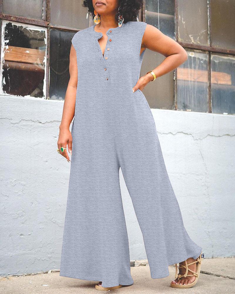 Plus Size Buttoned Sleeveless Wide Leg Jumpsuit, Gray