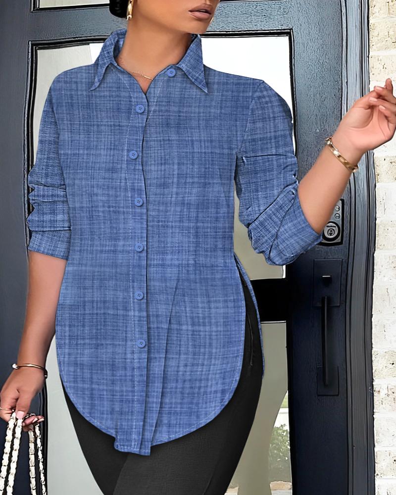 Plus Size Buttoned Slit Asymmetrical Shirt, Blue